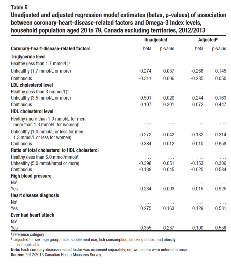 Interpretation: Omega-3 Index levels among Canadian adults were strongly related to age, race, supplement use, fish consumption, smoking status and obesity. Fewer than 3% of adults had Omega-3 Index levels associated with low risk for CHD.