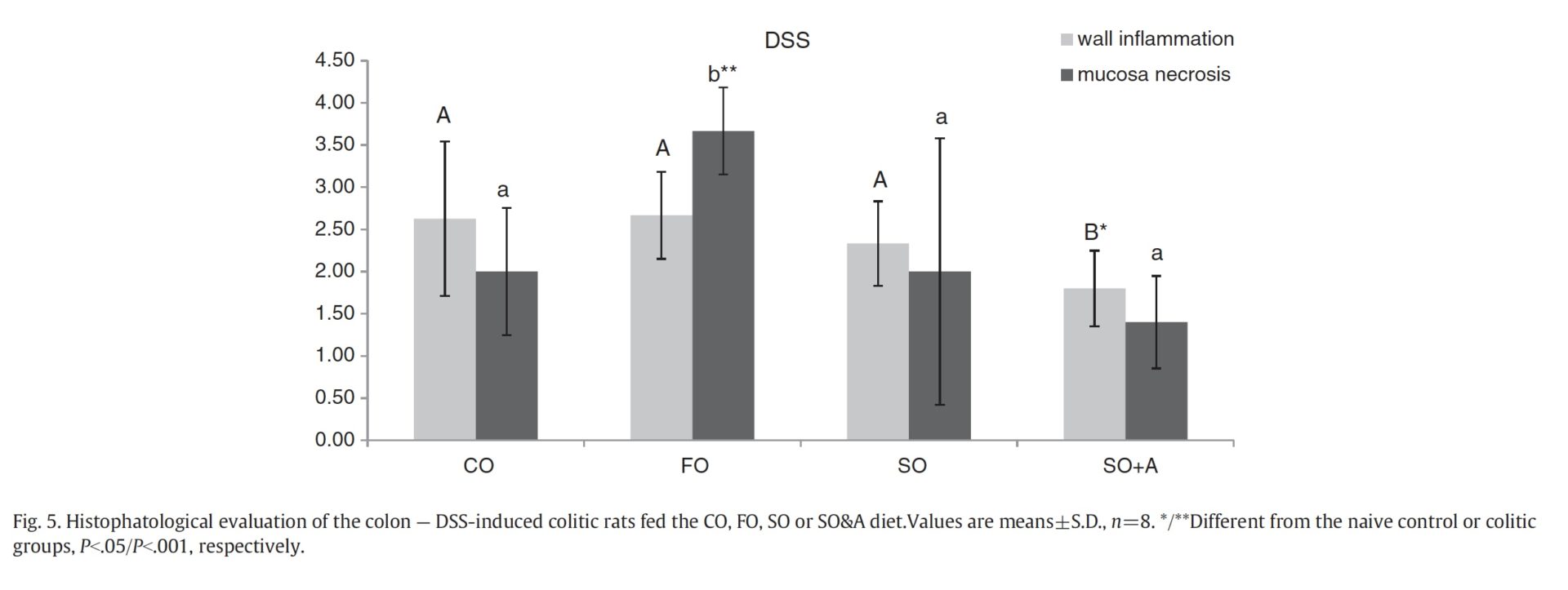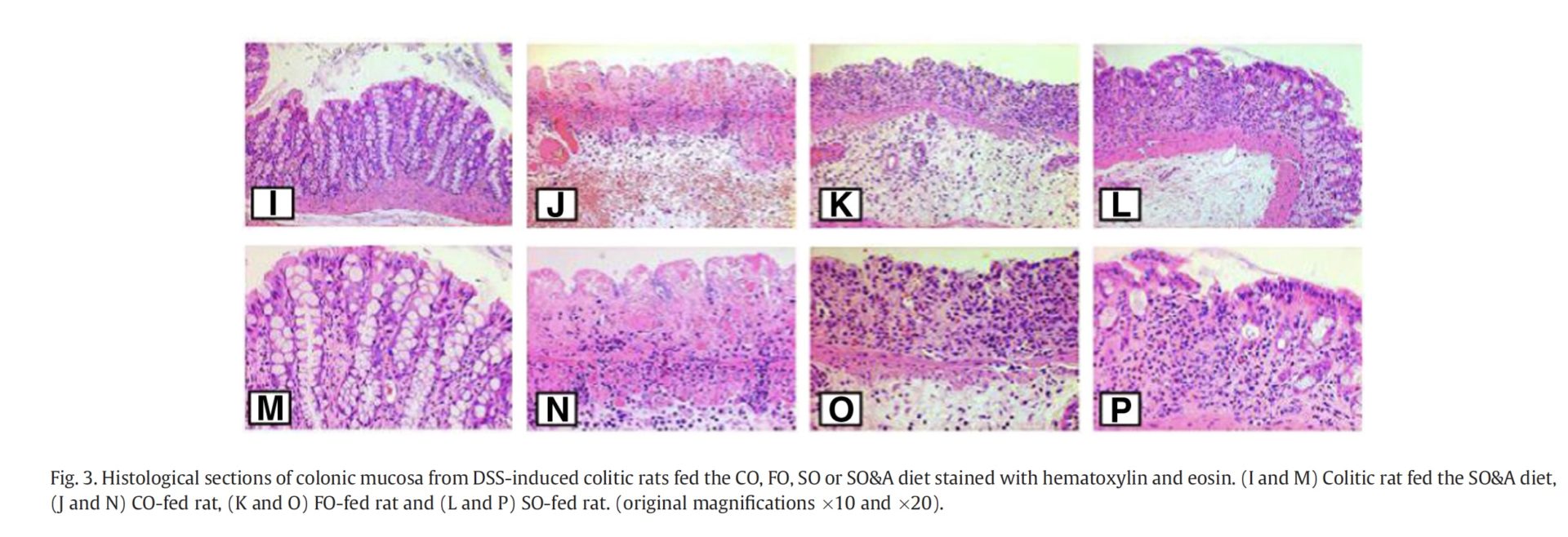 כאשר נבדקו תוצאות ההיסטולגיה של המוקוזה של המעיים של חיות המעבדה החוקרים גילו תגלית מפתיעה, רקמת המעיים של החיות שהיו חולות בקוליטיס וניזונו משמן מרווה מרושתת הבריאה כמעט לחלוטין ( אותיות I M J N בתמונה למטה), לעומת זאת רקמת המעיים של חיות מעבדה אשר הוזנו בשמן דגים(L ו P) ושמן תירס (K ו O) הראו תהליך דלקתי מתקדם משולב בדימום משמעותי במעיים.